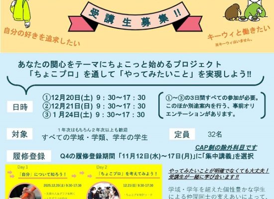お知らせ「融合先導知実践演習A(ちょこっとマイプロジェクト)」【2単位】【共通教育・自由履修科目(Q4・集中講義)】を開講します -